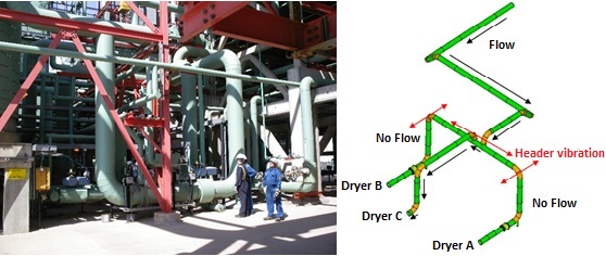 Normally the gas flow travels through two dryers and no vibration issues occur but under regeneration, the operators use only one dryer. When flowing to one dryer, the operator measured high vibrations in the header as shown by the red arrows (above, right).