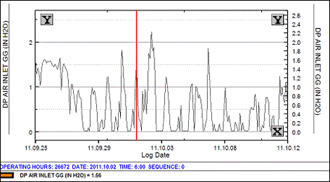 Air inlet differential pressure had been quite steady at 1.5 – 2.0 in. H2O. Then, near the end of September, 2011, the reading started to vary, from about 2 in. H2O down to zero.