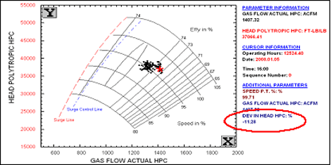 In this case, centrifugal compressor performance is evaluated against the wheel curve baseline for this particular unit. This is the best approach to monitoring centrifugal compressor performance, especially where operating conditions vary significantly.