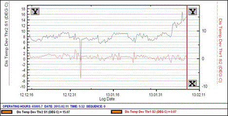 | Observation/Action | Issue raised Feb 11, 2013: Discharge temperature deviation throw 2 stage 1 has increased from 8 to about 16 °C since Feb 05, 2013. |
