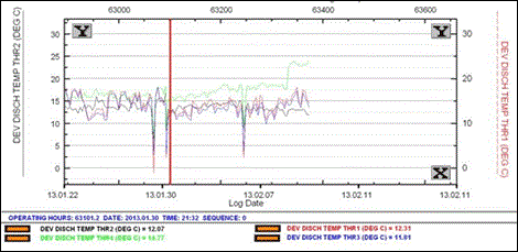 | Observation/Action | Issue raised Feb. 11, 2013. Discharge temperature deviation on throw 4 has been increasing since Jan. 30 2013 and reached from 14 to 24 °C on February 11, 2013. |