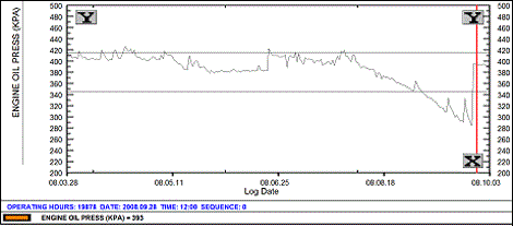 An engine oil pressure pattern anomaly was observed by a Wood analyst. The pressure was seen to be on a downward trend, though still at acceptable levels.