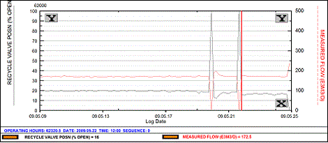 Further confirmation is found from measured flow (after the recycle valve) and recycle valve position. Over the same time period as the previous graphs, the flow is essentially constant. But the recycle valve position decreases from about 20% to about 15%.