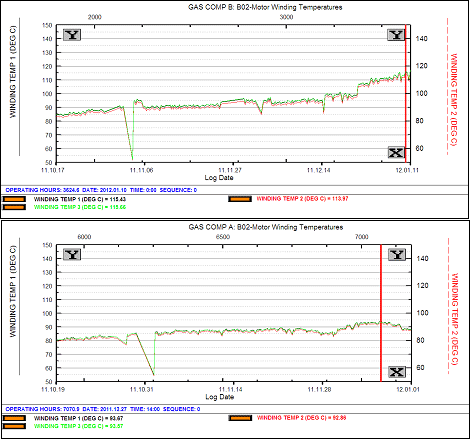 | Observation/Action | B1105, created Jan 16, 2012. Unit B motor winding temps reached 116 °C and were rising steadily. Unit A motor winding temperatures were about 95 °C, and unit C motor about 85 °C. |