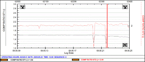 For confirmation we can check the stage compression ratios. The stage 1 compression ratio decreases and the stage 2 compression ratio increases. This is consistent with performance degradation on stage 1.