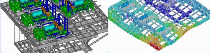 - Integrate machinery skid and equipment FEA models to the platform model (see picture below). Accurate modeling of excitation forces, load paths, and mounting options is necessary.
